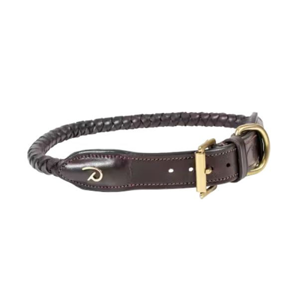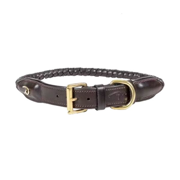 This dog collar has matching stitching, brass buckles and round braided leather details. The collar comes in brown and black.