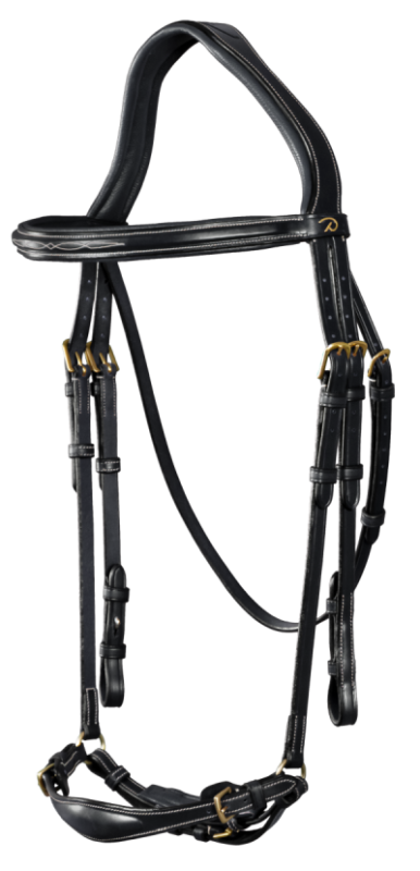 Bridle crafted from Grade 1 Catalan leather with dyon’s latest innovation – the S shaped anatomic headpiece. Features a padded, slightly raised drop noseband which is adjustable with 2 side buckles, padded with supple neoprene (instead of leather) with a crank in supple leather with nylon lining and protective padded soft leather tab. A padded, slightly raised and fancy stitched browband with cream stitching & brass buckles