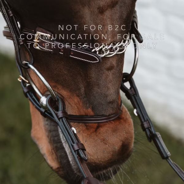 Slightly square- raised noseband with decorative topstitching. Chain at the back of the noseband and nosestrap. Can be fitted to the D Collection bridles