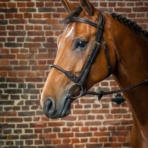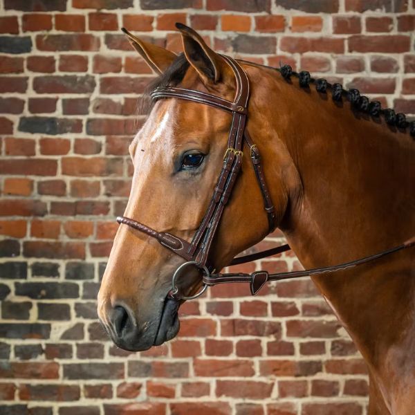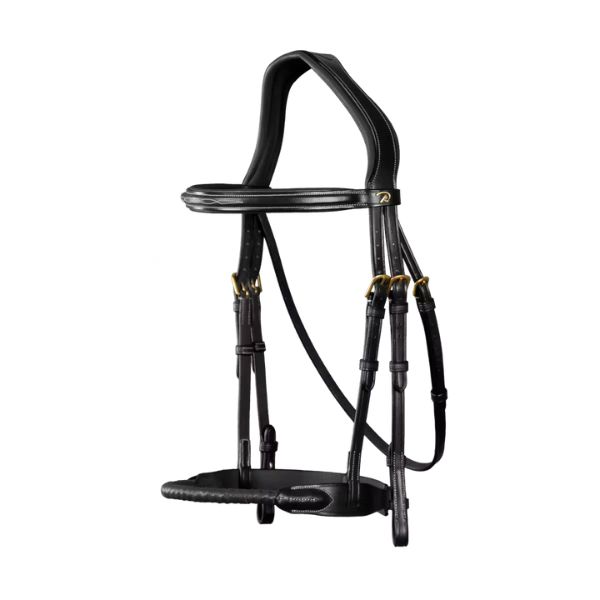 Slightly square- raised browband with decorative topstitching 2- in-1 snaffle and dropped noseband. Depending on the desired effect, the snaffle or dropped version may be used (effect of the dropped noseband without its constraints so as not to press on the corners of the mouth). Buckle of the snaf f le noseband mounted on a padded protective leather backing Front part of the dropped noseband made of extra-supple leather