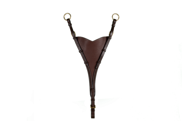 Adjustable bib martingale attachment in soft Catalan leather. Fastens to breastplate with a brass roller buckle. Features cream stitching & brass fittings