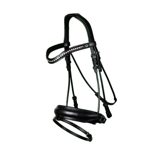 Matte Large Crank Noseband Bridle With Flash in round leather Supple V-shaped browband decorated with genuine Swarovski crystals Supple anatomical 38 mm wide noseband Noseband available in matte leather, patent leather, or patent leather with white lining Pull-back closure mounted on a padded protective backing 1/2” (13 mm) removable flash strap