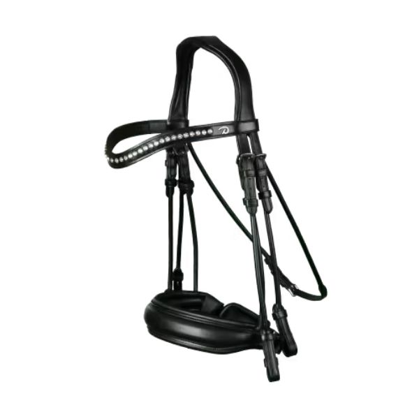 Matte Large Crank Noseband Double Bridle Supple V-shaped browband decorated with genuine Swarovski crystals Supple anatomical 38 mm wide noseband Noseband available in matte leather, patent leather, or patent leather with white lining Pull-back closure mounted on a padded protective backing