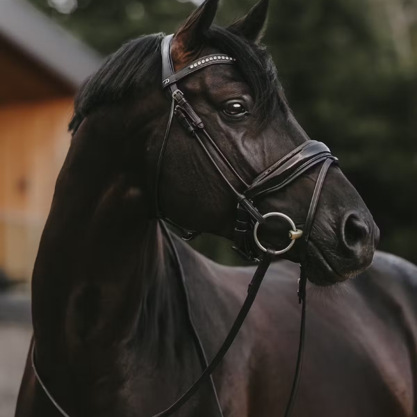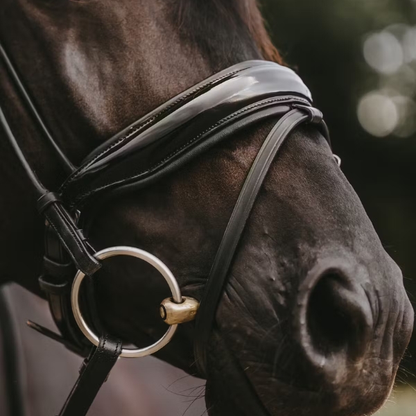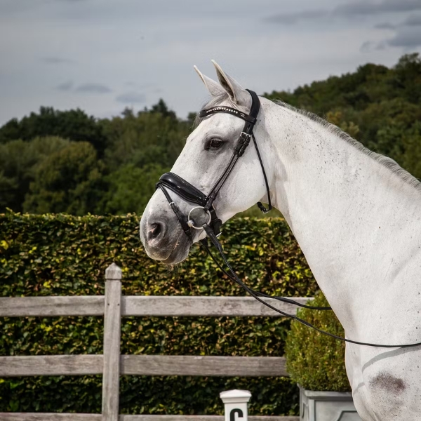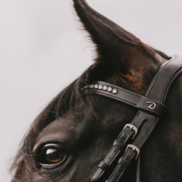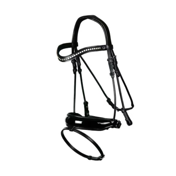 Matte Large Crank Noseband Bridle With Flash in round leather Supple V-shaped browband decorated with genuine Swarovski crystals Supple anatomical 38 mm wide noseband Noseband available in matte leather, patent leather, or patent leather with white lining Pull-back closure mounted on a padded protective backing 1/2” (13 mm) removable flash strap