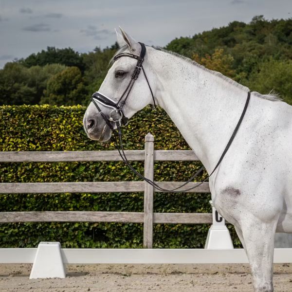 In summary, the Patent Large Crank Noseband Bridle with White Padding and Flash offers a perfect blend of striking elegance, control, and comfort. Its high-quality materials, innovative design, and thoughtful features make it an essential choice for riders looking to enhance their horse’s responsiveness and overall performance. Whether you’re training at home or competing in the arena, this bridle is designed to meet the highest standards of both horse and rider.