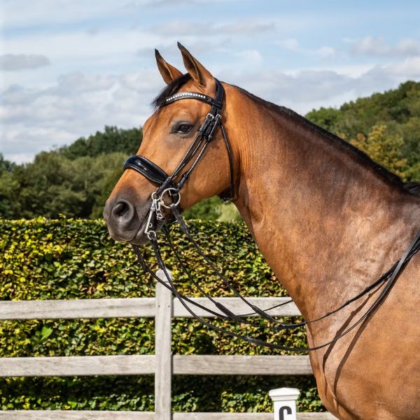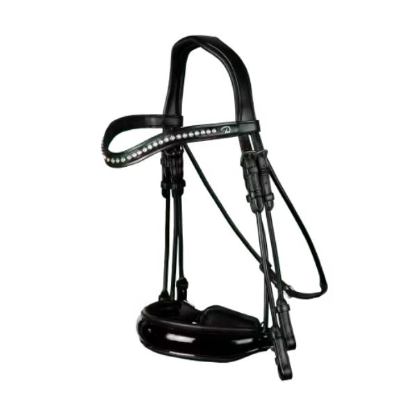 Patent Large Crank Noseband Double Bridle Supple V-shaped browband decorated with genuine Swarovski crystals Supple anatomical 38 mm wide noseband Noseband available in matte leather, patent leather, or patent leather with white lining Pull-back closure mounted on a padded protective backing