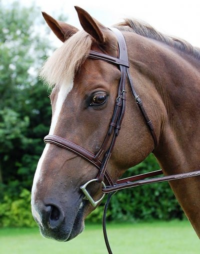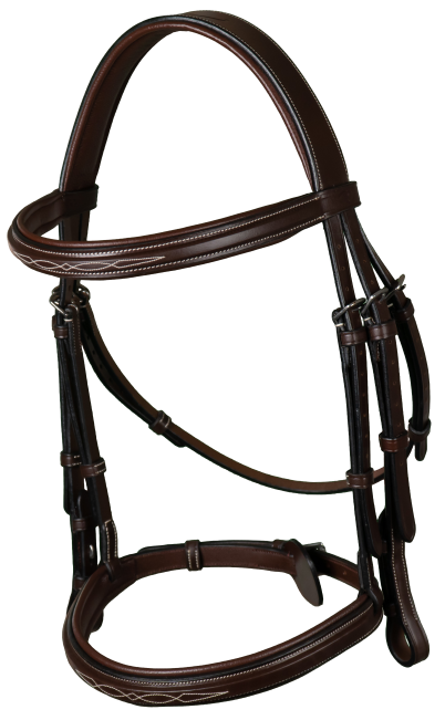Cavesson bridle in fine Catalan leather with anatomic headpiece. Features include fancy stitched, slightly square raised and padded cavesson noseband and browband. Cream stitching & stainless steel buckles.