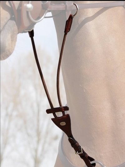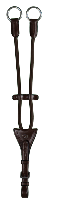 Running martingale attachment in 8mm round elastic and Catalan leather. Space between the 2 rings is adjustable by a sliding leather tab joining the branches. Can be fastened to yoke or breastplate with a roller buckle. Features matching colour stitching steel fittings