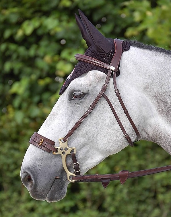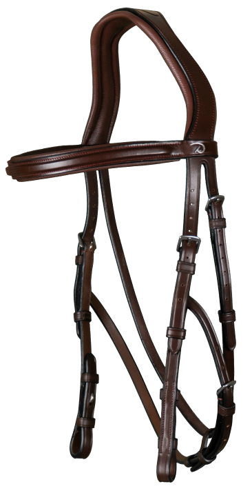 Hackamore bridle in fine Catalan leather. Features include Dyon’s latest innovation – the S shaped, anatomic headpiece – Includes noseband cheek pieces. The anatomic cutting totally releases the base of the ears. Neoprene padding and soft leather lining. Hackamore cheek pieces with adjustment strap on jawbone. Padded square raised brow band with steel Dy’on logo on left side. Matching colour stitching & stainless steel buckles