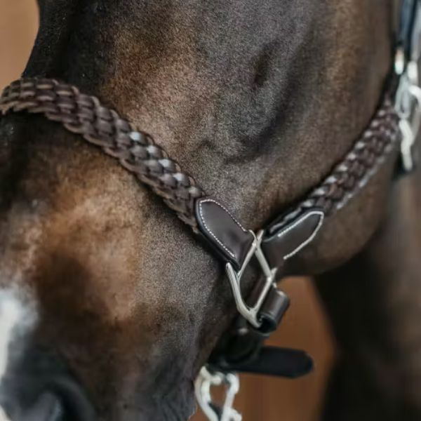 The throat latch of the halter is equipped with a snap closure.