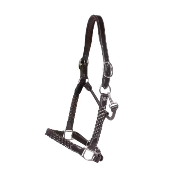 The halter has cream stitching and stainless-steel buckles. It has leather plaited details on the noseband and sides. It is available in black and brown.