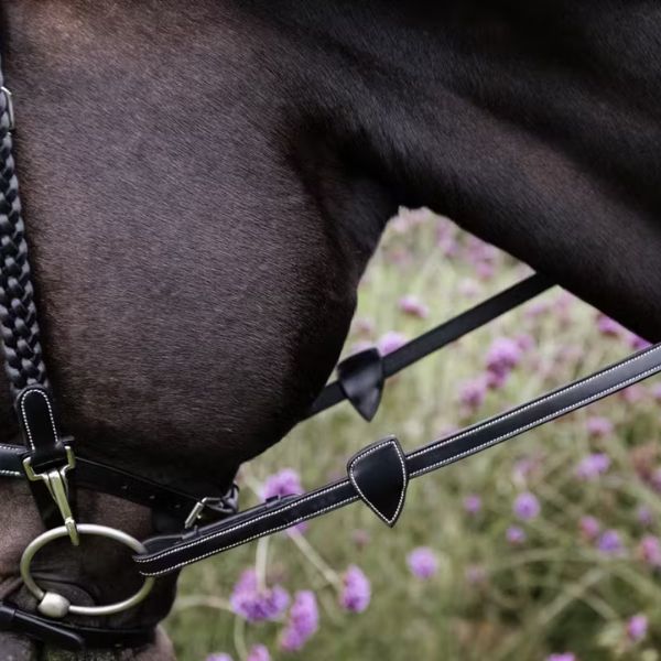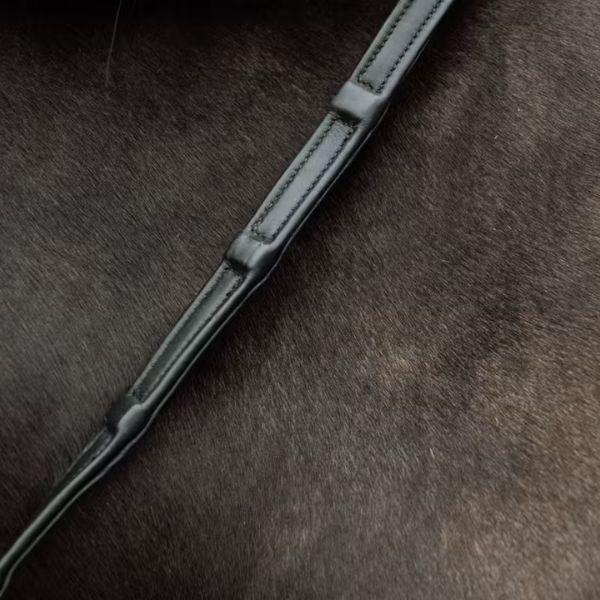 The reins are part of the Working collection, which means the color of the stitching is cream. The buckles are stainless-steel. Available in brown and black.