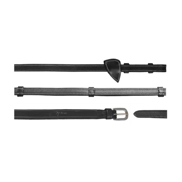The reins are part of the Working collection, which means the color of the stitching is cream. The buckles are stainless-steel. Available in brown and black.