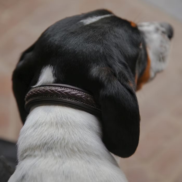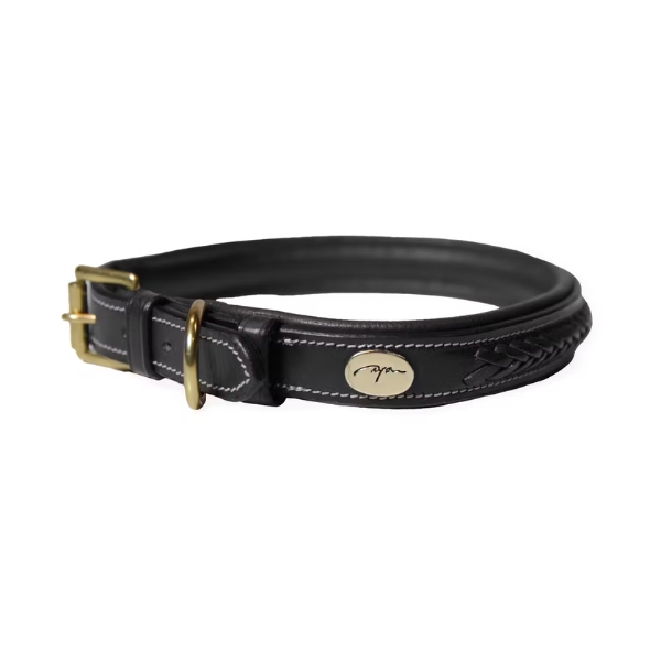 This dog collar has cream stitching, brass buckles and plaited leather details. The collar comes in brown and black.