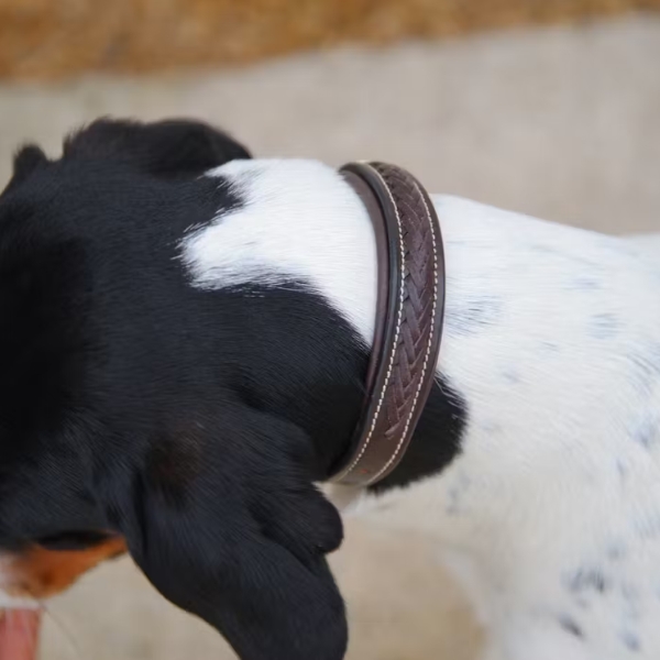• – This collar is equipped with a roller buckle and a brass Dy’on pin