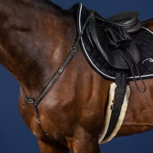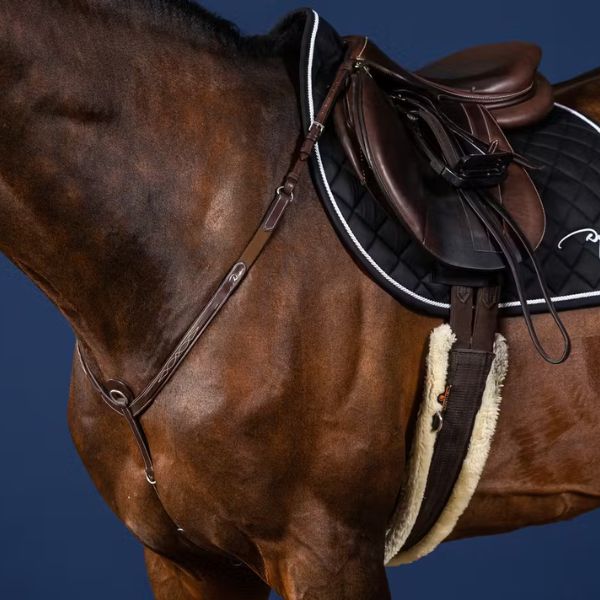 Breastplate in slightly square- raised leather with decorative topstitching Two additional dee rings for attaching lungeing gear 6 cm long elastic bands for comfort Snap hooks for attaching to the saddle